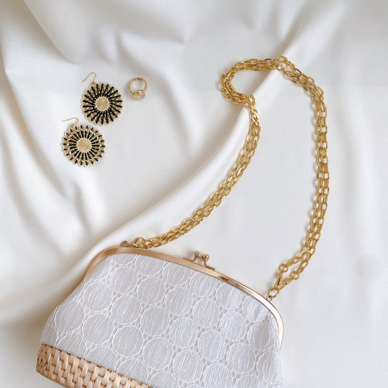 ベージュを基調とした生地にホワイトカラーのレースが施されています。