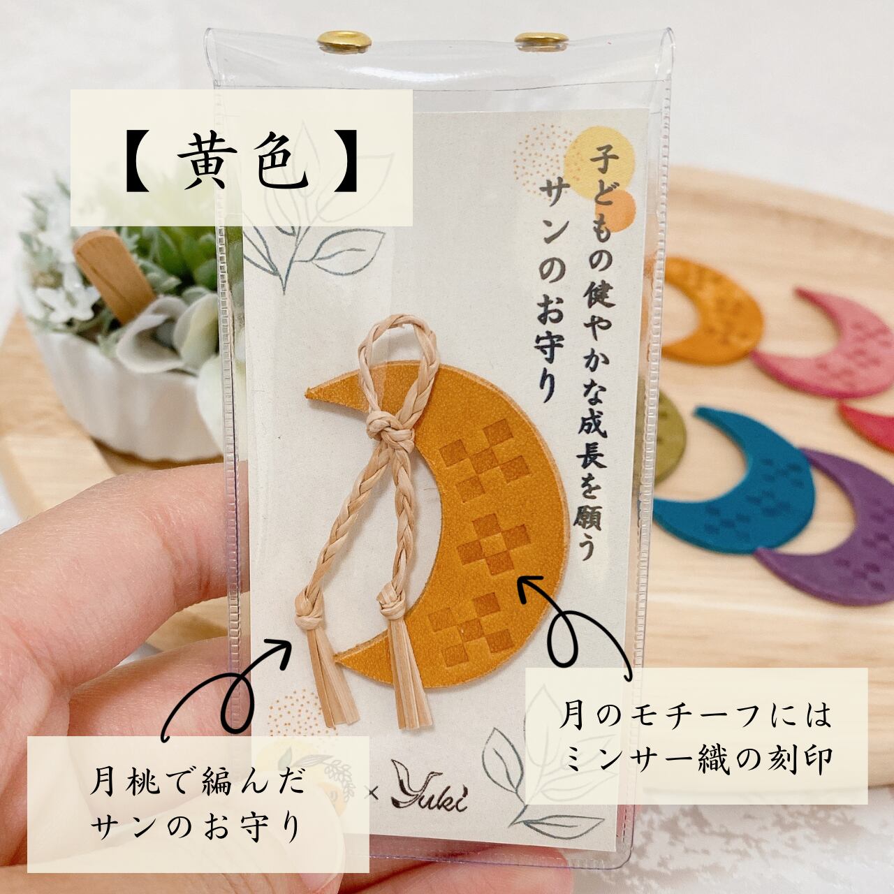 また子ども用のお守りには、月をモチーフにした革にミンサー柄が刻まれています。