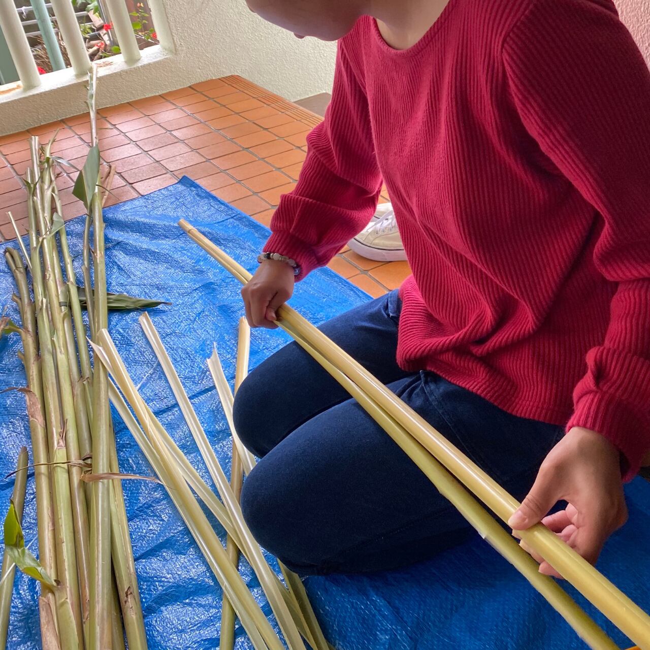 月桃は沖縄の生活に溶け込んでおり、沖縄を代表する植物です。月桃の茎を一枚一枚折れないよう丁寧に剥がし真っ直ぐに乾かすために一つずつ巻きながら乾燥させます。乾いた月桃は一つ一つ拭き伸ばし綺麗にします。