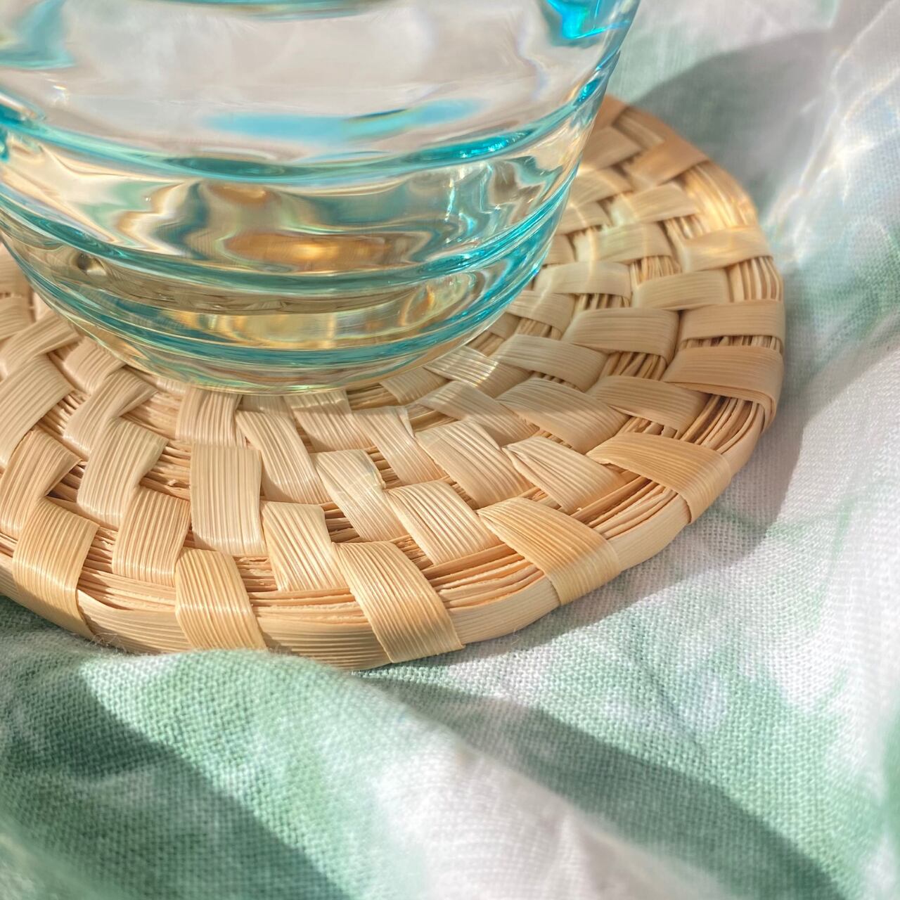 コースター(太陽)はその名の通り、月桃の編み目が太陽の光のように放射状に広がっています。